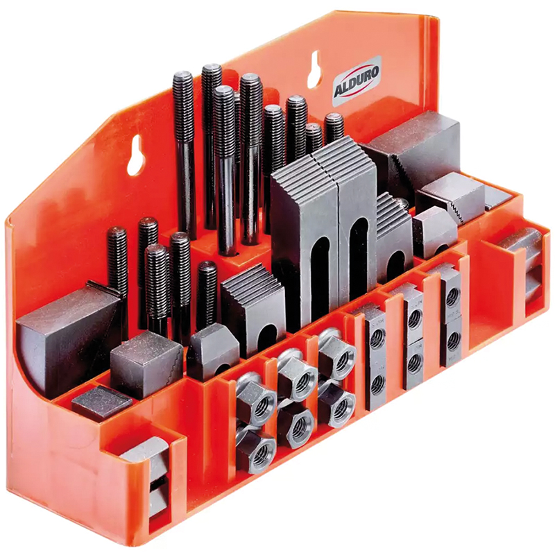 Inhalt: 24 Stk. Gewindebolzen (je 4) 75/100/125/150/175/200 mm, 6 Stk. T-Nutensteine, 4 Stk. Kupplungsmuttern, 6 Stk. Flanschmuttern, 6 Stk. Spannbriden, 6 Stk. Stufenblöcke