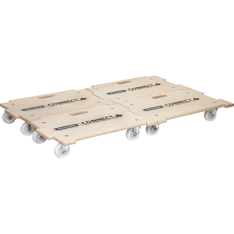 ideal für den Transport von Ladungen (fast) jeder Grösse, lässt sich sowohl einzeln als auch in Kombination zu mehreren einsetzen, einfach zwei, drei oder mehr Roller zusammensetzen und die gewünschte Ladefläche gewinnen, das funktioniert wie bei einem Puzzle - ohne Montage und ohne Werkzeug, die benötigte Ladefläche kann in jede Richtung verlängert oder verbreitert werden, eine Vervielfachung ist quasi grenzenlos möglich, ein in die Ladefläche eingearbeiteter Tragegriff ermöglicht das bequeme Handling von und zum Einsatzort, vier hochwertige Apparaterollen sorgen für beste Laufeigenschaften auf allen weichen / robusten Boden-Oberflächen