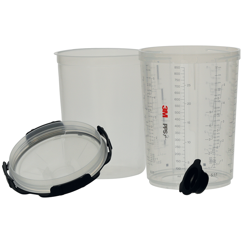 wiederverwendbare Becher aus Hartplastik mit klaren Sichtfenstern erleichtern das Wiederbefüllen durch Halten des Beutels, während der Deckel abgenommen wird, durch das Sichtfenster lässt sich beim Sprühen leicht erkennen, wie viel Material übrig ist, es bietet auch eine vertikale Ansicht, um ein gleichmässiges Mischen der Materialien sicherzustellen, bei den Bechern sind in jedem Becher die Mischungsverhältnisse aufgedruckt, um eine möglichst präzises Mischen zu ermöglichen, dieses Produkt kann ausschliesslich mit Artikeln der 3M™ PPS™ 2.0 Serie verwendet werden.