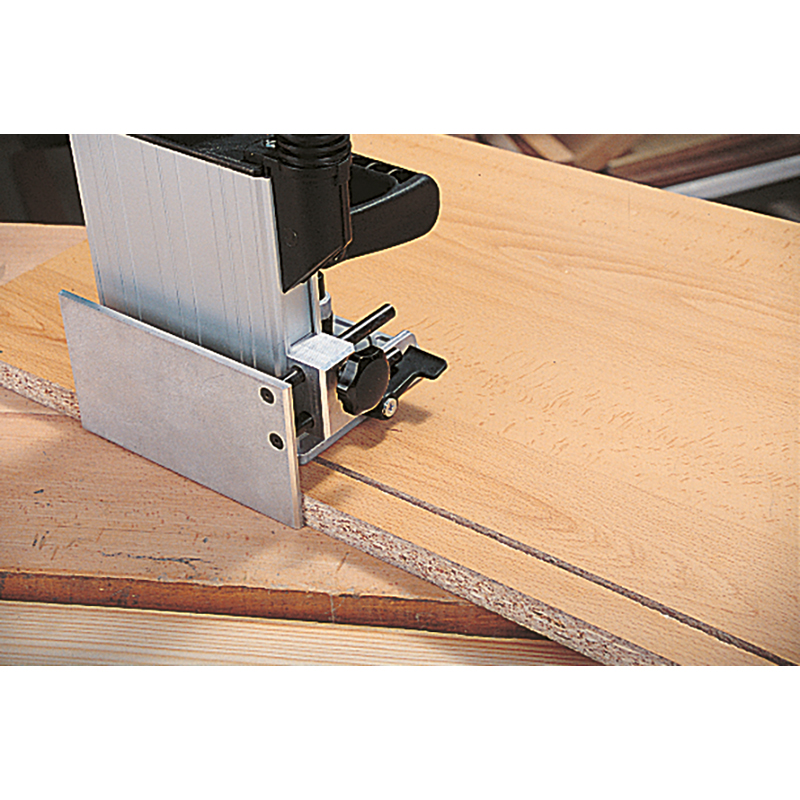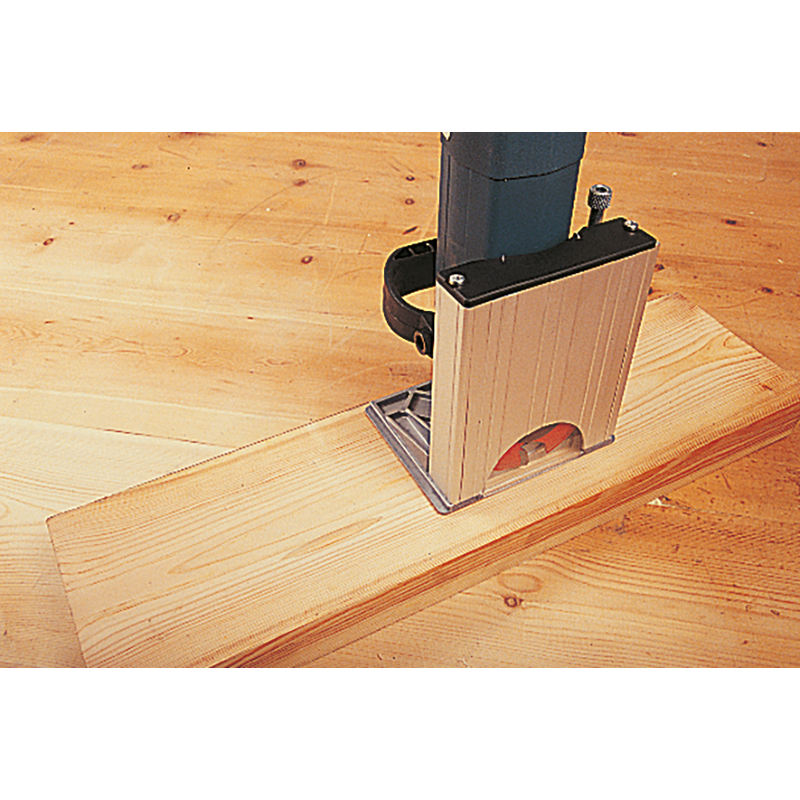 Zur einfachen Herstellung von Nuten für verschiedene Lamellendübel, höhen- und winkelverstellbarer Fräsvorsatz ermöglicht eine variable Herstellung aller gängigen Verbindungsarten ohne weiteres Zubehör, schnelle und einfache Herstellung von Gehrungsverbindungen, Eckverbindungen, Verbindungen in der Plattenmitte, etc, mit Spanauswurf und Anschluss an eine externe Staubabsaugung,