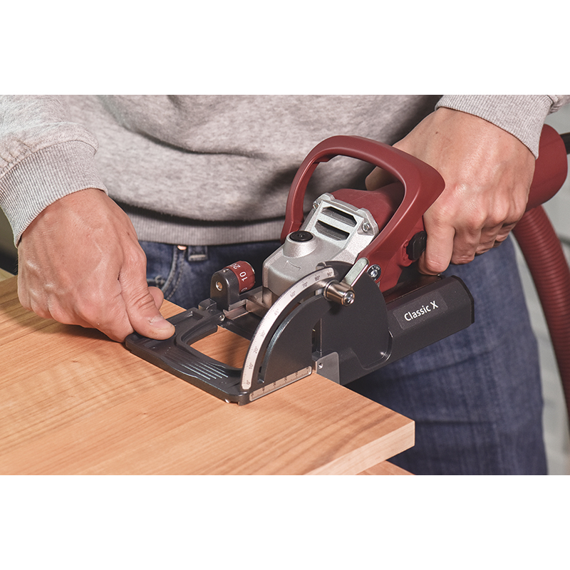 zum Fräsen von Nuten für Lamello-Plättchen für Verbindungen ab 8 mm Materialstärke, zum Ausflicken von Harzgallen, zum Schneiden von Schattenfugen, zum Einlassen der Möbelscharniere Lamello Duplex, beidseitig bündige Anschläge für effizientes Positionieren der Maschine an der Werkstückaussenkante