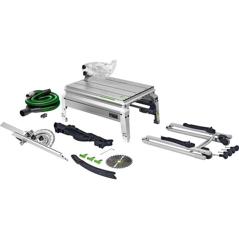 Lieferumfang: Universal-Sägeblatt HW Z 32, Winkelanschlag, Klappbeine, Splitterschutz 3x, Absaug-Set, Schiebestock, Zubehör-Garage, Abstützung mit Transportrolle, Bedienungswerkzeug, im Karton