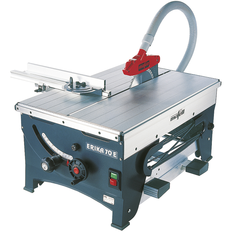 Stufenlose elektronische Drehzahlregulierung, Sanftanlauf, für Neigungsschnitte bis 48 Grad, stabiles Tischprofil, mit Untergestell zum sekundenschnellen Ausklappen,