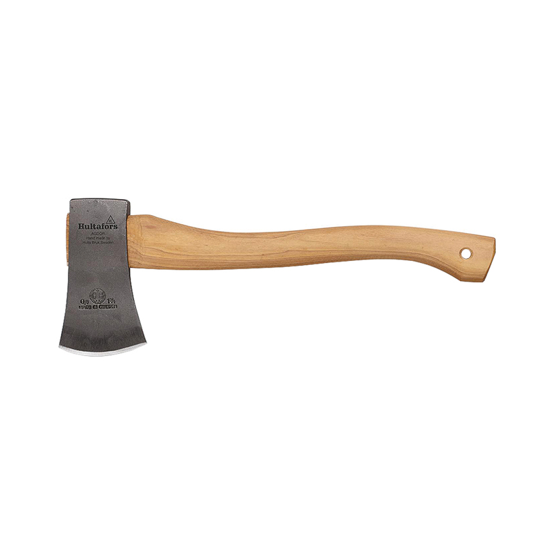 eine kleine Axt für den Ausseneinsatz in Wäldern und auf offenem Gelände, handgeschmiedet aus gestrahltem und klar lackiertem schwedischem Axtstahl, eignet es sich auch für Arbeiten im Garten, der Schaft ist gebogen und aus Hickoryholz gefertigt, ein Kantenschutz ist im Lieferumfang enthalten.