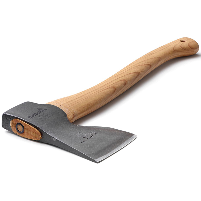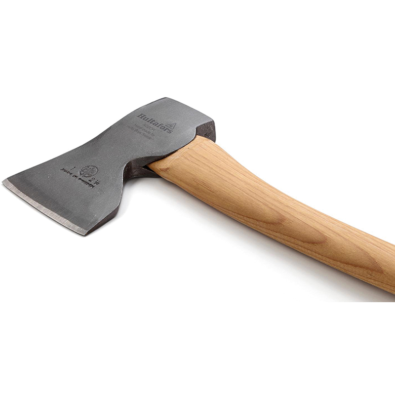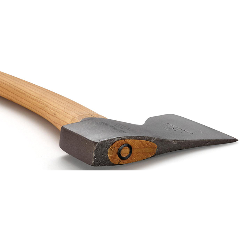 sandgestrahlter und klar lackierter Schmiedekopf, der Kopf ist am Stiel mit einer Aussparung versehen, damit die Hand bei Schneidearbeiten direkt über der Schneide gehalten werden kann, handgeschmiedet aus schwedischem Axtstahl, mit deutlicher Härtezone, innerhalb derer die Schneide nachgeschliffen werden kann, ohne an Härte zu verlieren, geschwungener Stiel aus Hickoryholz