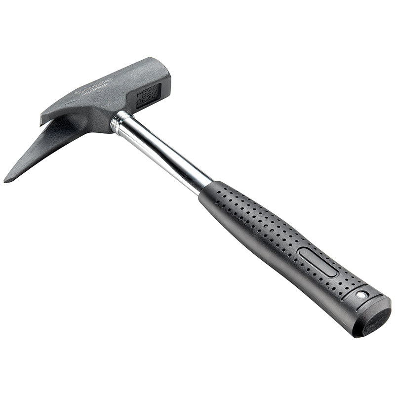 Kopf stahlgeschmiedet, sorgfältig gehärtet poliert und schwarz beschichtet, Kopf und Stiel vernietet, Ansatz mit Stahlrosette, mit magnetischem Nagelhalter, Stahlrohrstiel verchromt, schwarzer Kunststoffgriff