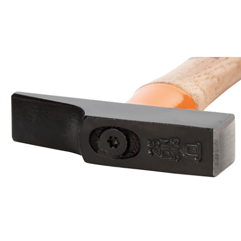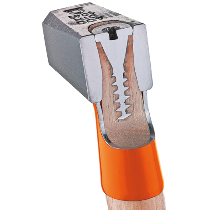 aus legiertem Spezialstahl, sorgfältig gehärtet und angelassen, Kopf schwarz pulverlackiert, korrosionsgeschützt, französische Form, Bahn und Finne geschliffen, Kanten sauber gebrochen, sichere Verbindung von Kopf und Stiel durch patentierte Secutec® Keilschraube, gehärtete Stielschutzhülse, doppelt geschweifter Hickorystiel