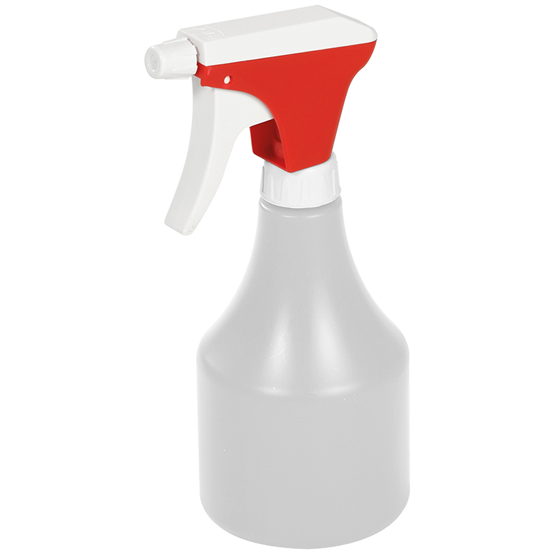 in robuster, handlicher Ausführung, gut stehend, Flasche aus PE-HD, Sprüh-Kopf und Düse aus PP und PE, daher gut chemikalienbeständig auch gegen aggressive Medien, Düse durch Drehung vollständig absperr- oder verstellbar, von ganz feiner Zerstäubung bis zu einem schmalen, kräftigen Sprühstrahl, Hubvolumen 1,3 ml.