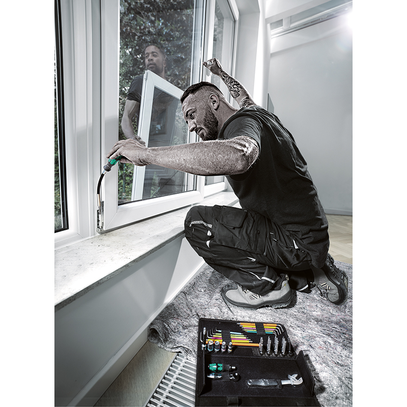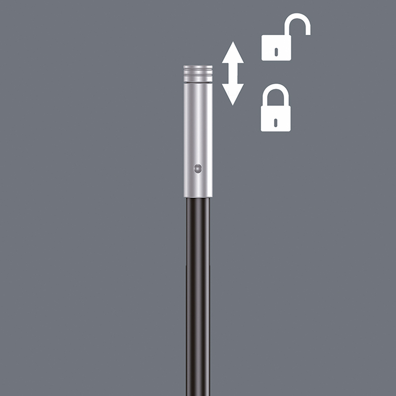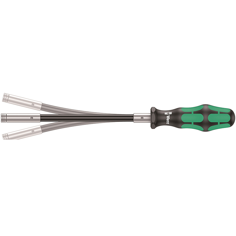 Schraubendreher mit biegsamem Schaft zum Erreichen schwer zugänglicher Stellen, dank der Konstruktion mit besonders schlankem Bithalter können unterschiedliche Schraubprofile auch in sehr engen Arbeitsräumen betätigt werden, mehrkomponentiger Kraftform Griff für hohe Arbeitsgeschwindigkeiten und besonders ergonomisches Verschrauben, mit Sechskantabrollschutz gegen Wegrollen