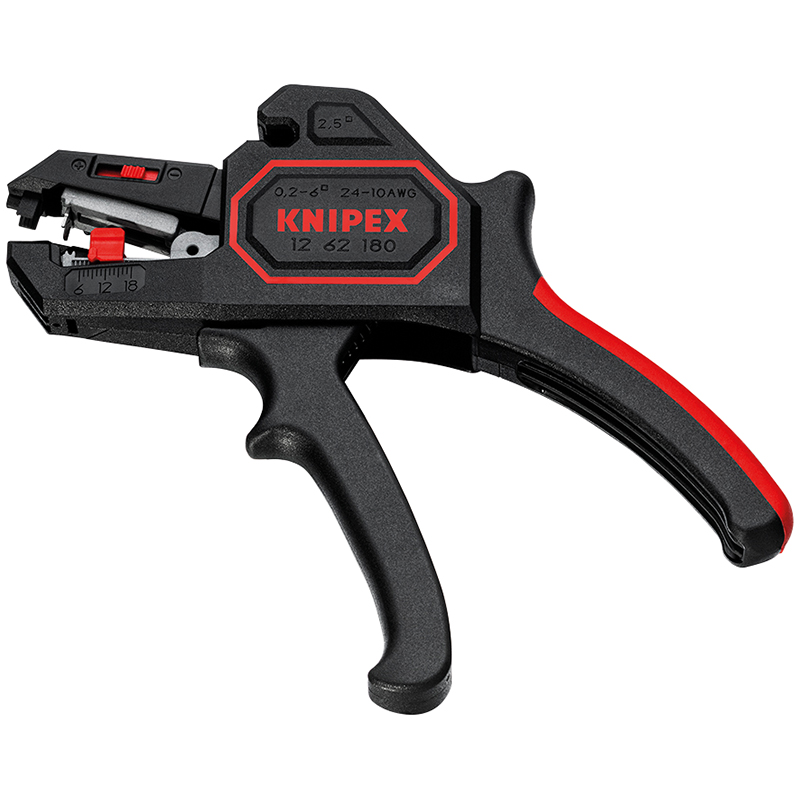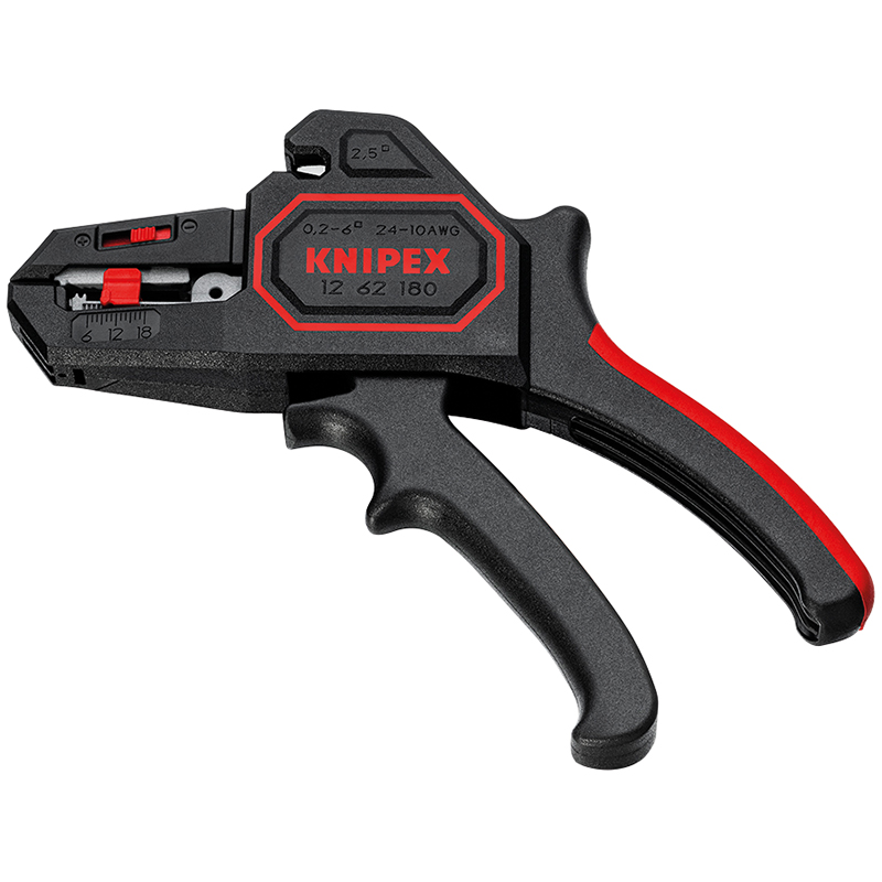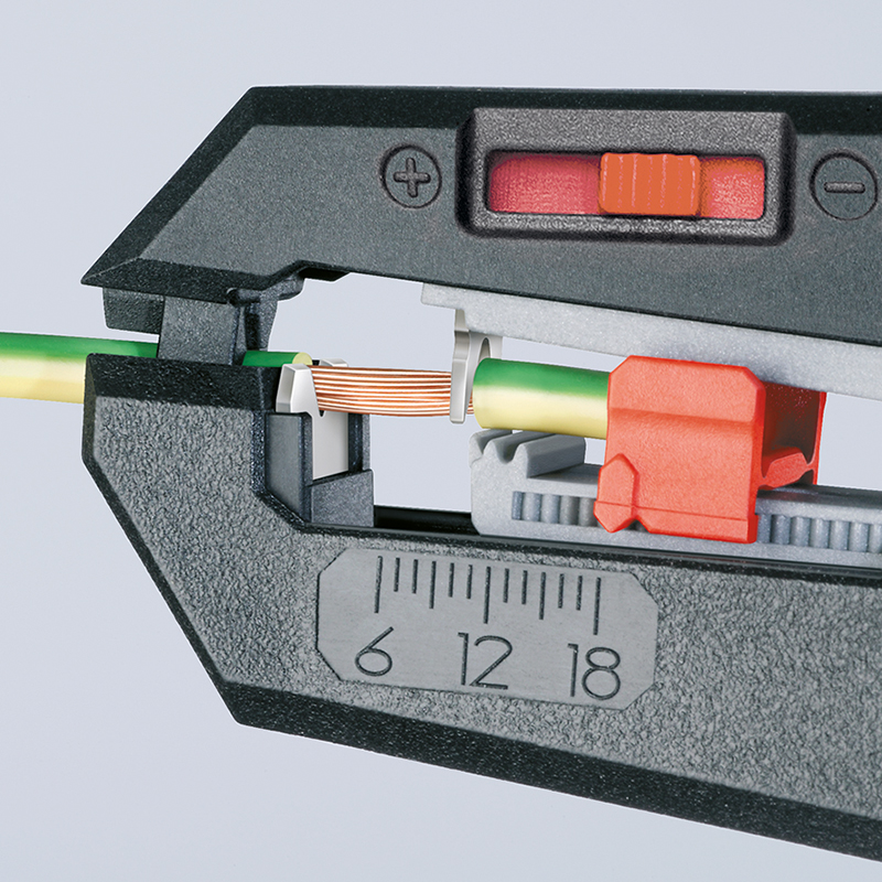 Isoliert Kabel mit Standard-Materialien ohne manuelle Einstellung ab, Feinjustierung ermöglicht die genaue Einstellung der Messer auf spezielle Materialien oder Temperaturbedingungen, kompaktes, handliches und leichtes Werkzeug für gängige Kabelquerschnitte und Isoliermaterialien, für ein-, mehr- und feindrähtige Leiter von 0,2 bis 6 mm² mit Standard-Isolation, schlanke Kopfform für den Einsatz in schwer zugänglichen Arbeitsbereichen, mit Drahtschneider für Cu- und Al-Leiter bis max. 2,5 mm², mit einstellbarem Längenanschlag von 6,0 bis 18,0 mm für gleiche Abisolierlängen