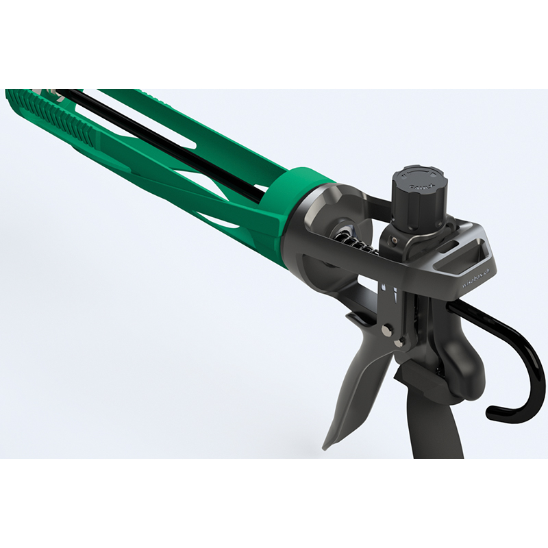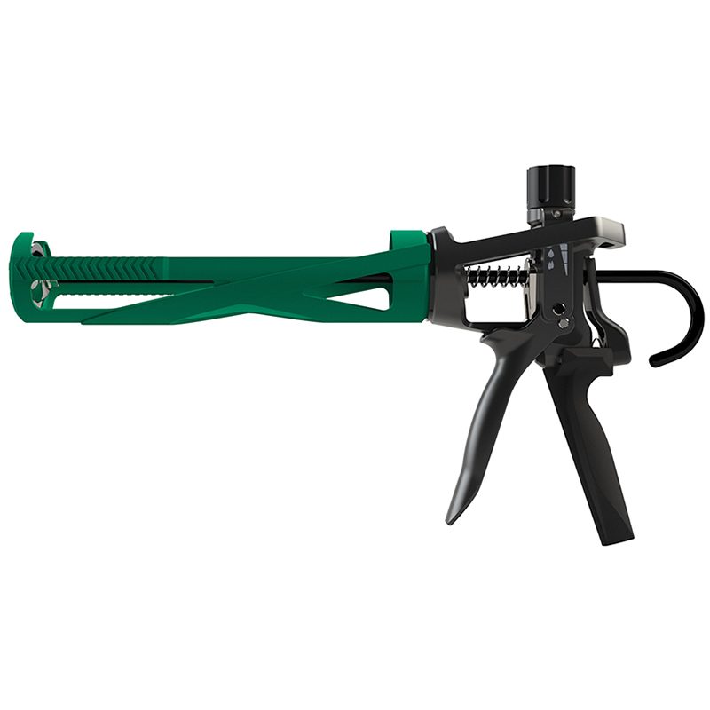 mit stufenlos einstellbarer Kraftübersetzung von 12:1 bis 25:1 (stufenlos regelbar), für 1K-Norm-Kartuschen mit Standard-Füllmenge 290 - 310 ml, für Produkte mit niedriger bis sehr hoher Viskosität, soft Handgriff mit optimierter Ergonomie, komplett gehärtete Stange bis zum Kern, drehbar, manuelle Kolbenentlastung, aus Aluminium und Stahl, für Raupenauftrag, Antrieb manuell