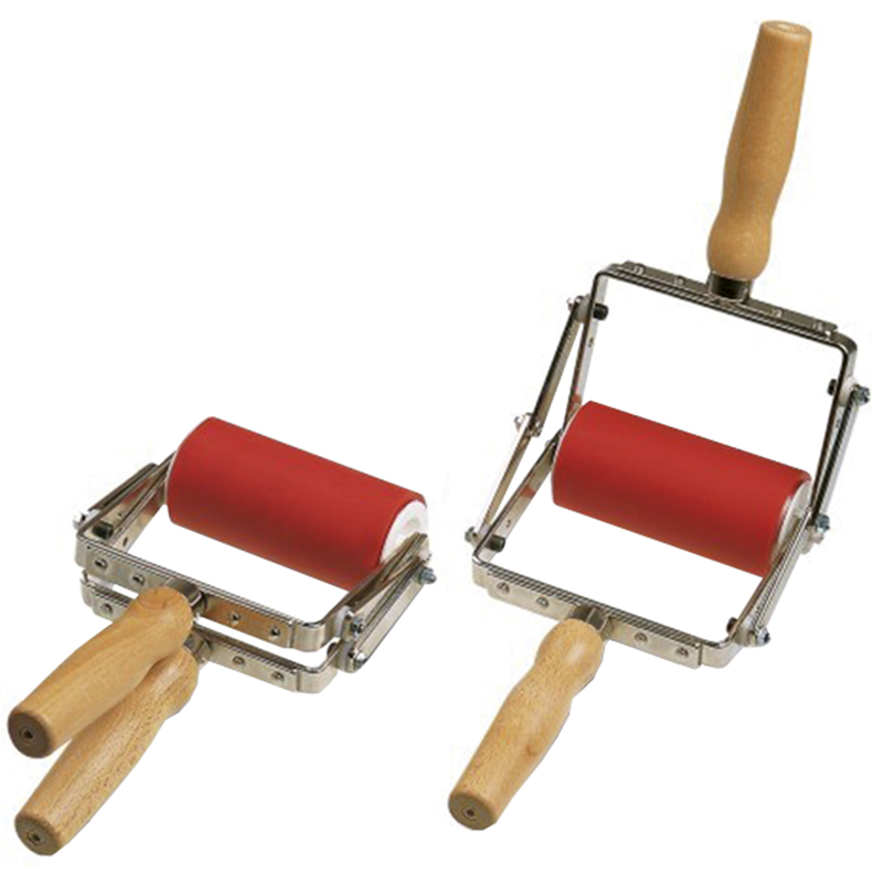 Revêtement de rouleau en plastique résistant à l'eau et à l'huile sous certaines conditions, noyau en alminium avec moyeux en plastique, le support en acier plat avec poignée en bois de hêtre possède deux douilles en plastique pour les paliers du rouleau, il en résulte un fonctionnement silencieux avec une usure minimale des axes de paliers, exécution solide idéale pour presser