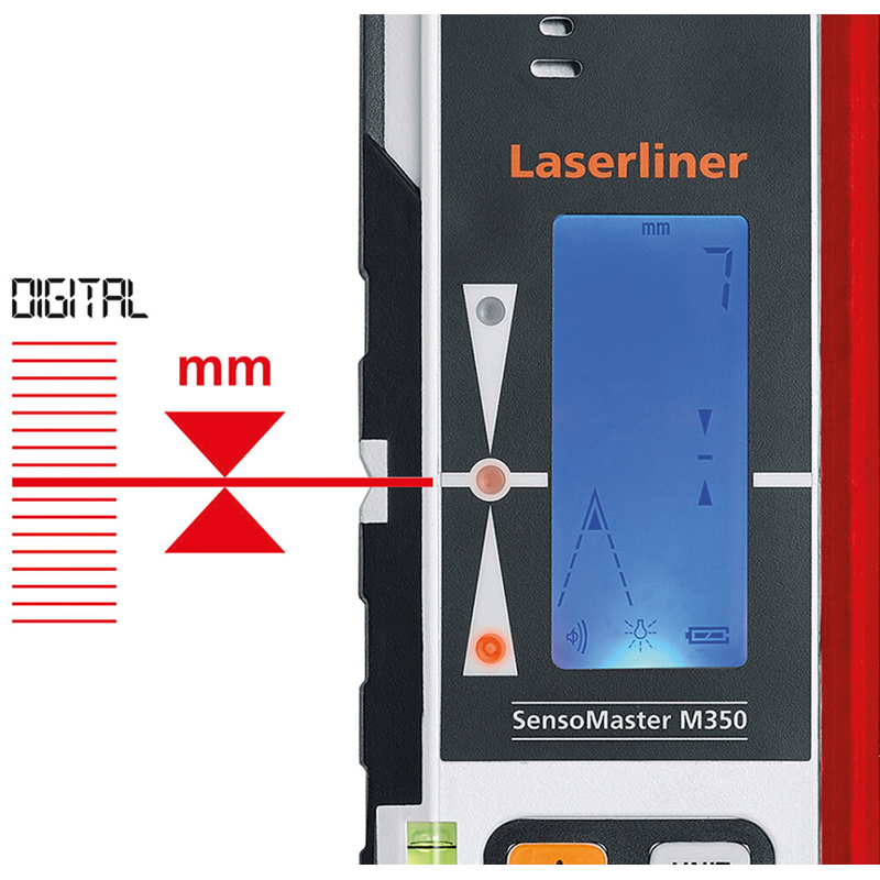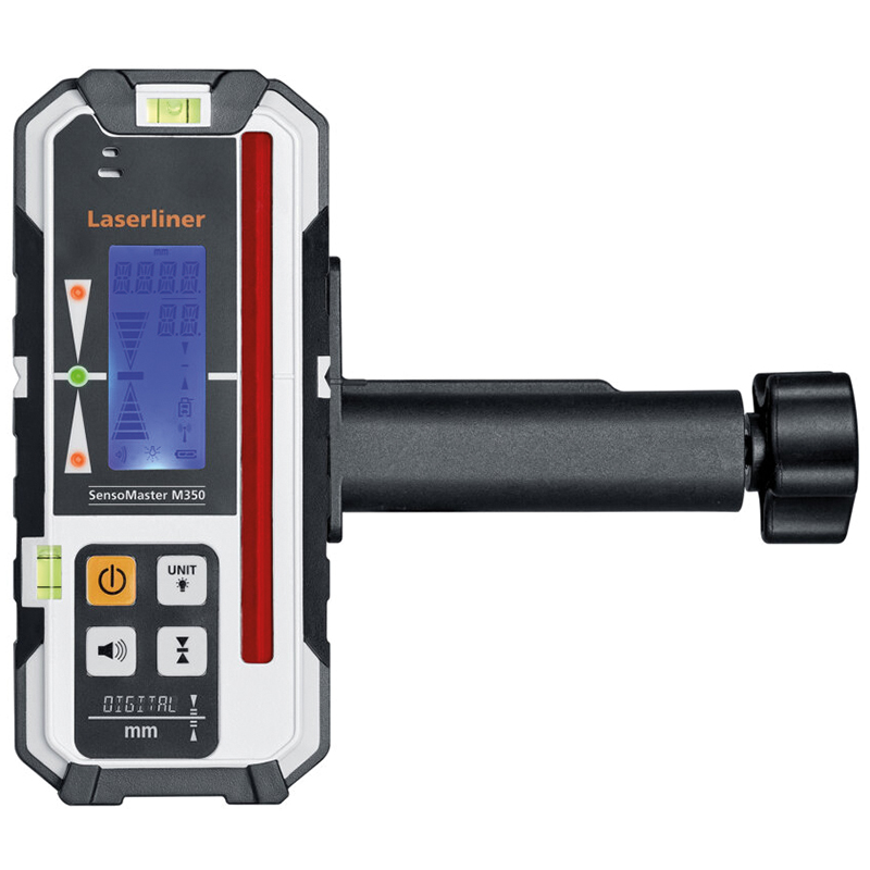 extrem lange Laserempfangseinheit zum schnellen Erfassen des Lasers auf grosse Distanzen, empfängt Höheninformation, die durch die LC-Displays vorne und hinten sowie drei helle Leuchtdioden vorne angezeigt werden, LC-Displays stellen die Höhendifferenz zur Laserebene grafisch über Pfeile und den Mittelbalken, als auch numerisch dar, Vertikal- und Horizontallibelle