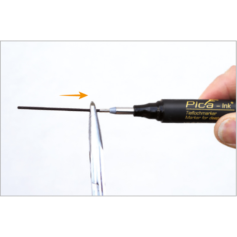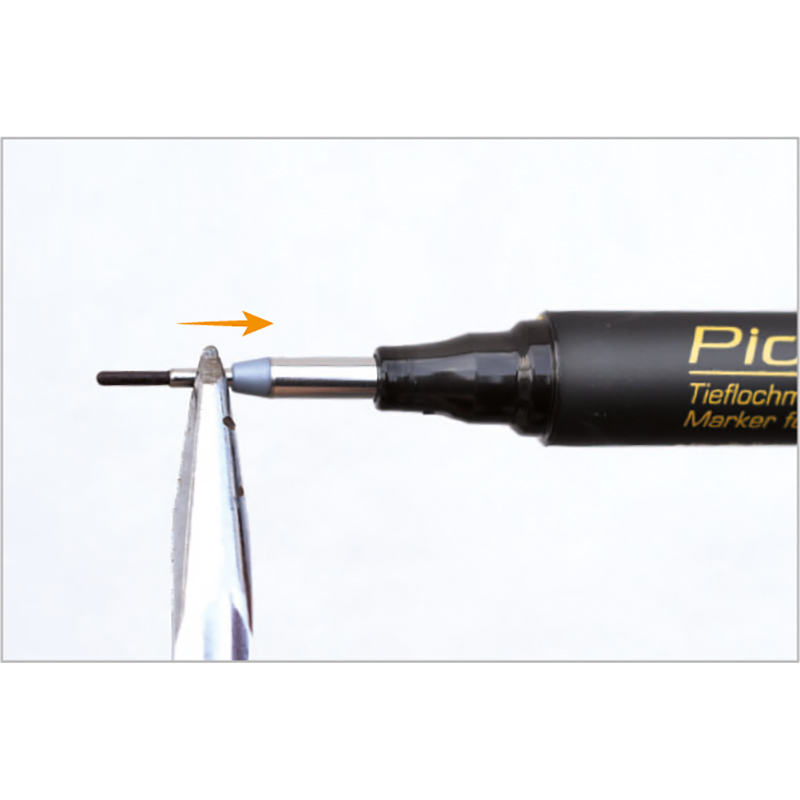 permanente Tinte auf Alkoholbasis, mit Alkohol von glatten Flächen entfernbar, sofort wasser- und abriebfest, selbst nachstellende, patentierte Edelstahl-Teleskopspitze, praktischer Köcherschoner mit Spezial-Clip für perfekte Ein-Hand-Bedienung