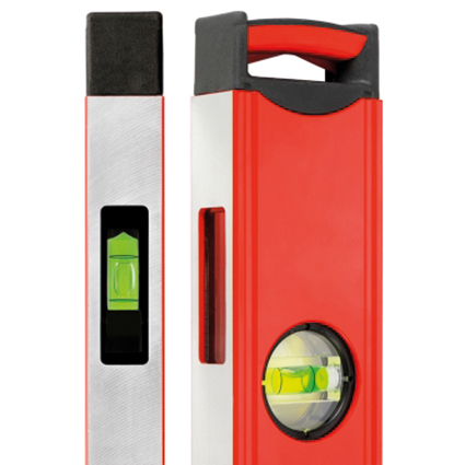Alu-Rohrprofil rot beschichtet, mit 2 gefrästen Messflächen bis 120 cm, Plump Site®; Dual-View™-Libelle, ermöglicht die Lot-Vertikallibelle sowohl nach der klassischen Methode, der Seitenansicht, als auch von der Vorderseite abzulesen, 2 vertikale Acrylglas-Blocklibellen, 1 Horizontallibelle mit Vergrösserungslinse, UV-beständig, rutschfeste Ergo Grip™-Griffe, stossfeste Endkappen aus zwei Materialien, Genauigkeit 0,5 mm / M