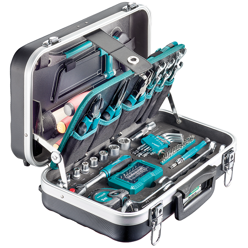 robuster ABS-Kunststoffkoffer mit Schreiner-Werkzeugen für Montage- und Servicearbeiten, sehr kompakte Grösse, dieser Koffer findet überall Platz