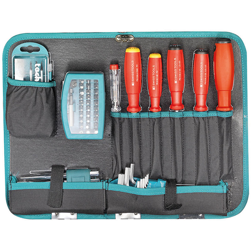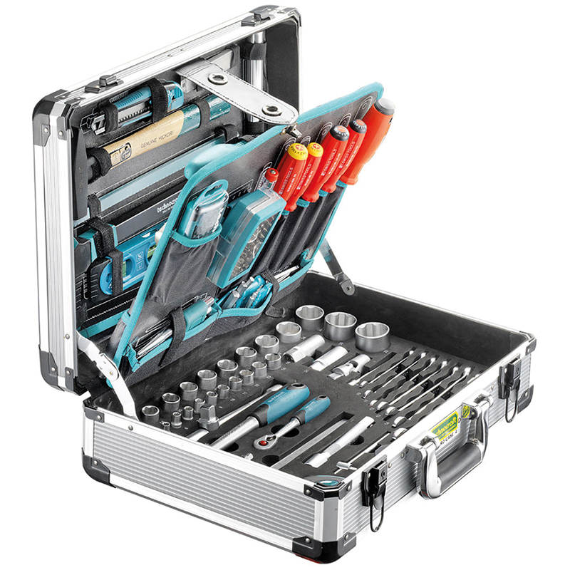 die ultimative Wahl für Profis, die höchste Ansprüche an ihre Werkzeuge stellen, dieser praktische Alu-Koffer enthält einen 140-teiligen Werkzeugsatz mit Original PB Swissgrip Schraubendrehern, Zangen, Gabelringschlüsseln, Stecknüssen 1/4" 4 - 14 mm und 1/2" 10 - 32 mm, Rollmeter, Messer, Säge und mehr