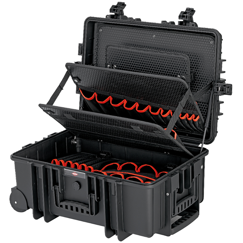 für härteste Einsatzbedingungen, staub-, wasserdicht und temperaturbeständig, flugtauglicher Koffer aus schlagfestem Polypropylen, automatisches Druckausgleichsventil, temperaturstabil von -30°C bis +80°C, Vorrichtung für Vorhängeschloss, Dokumentenfach; Werkzeugtafeln aus schmutzabweisenden PP-Hohlkammerplatten mit bestückbaren Werkzeugtaschen und -schlaufen, verschliessbare Bodenschale individuell unterteilbar durch Aluminium-Trennstegesystem, ergonomischer Zweikomponenten-Griff, insgesamt 147 Steckmöglichkeiten, max. Zuladung: 35 kg, leer