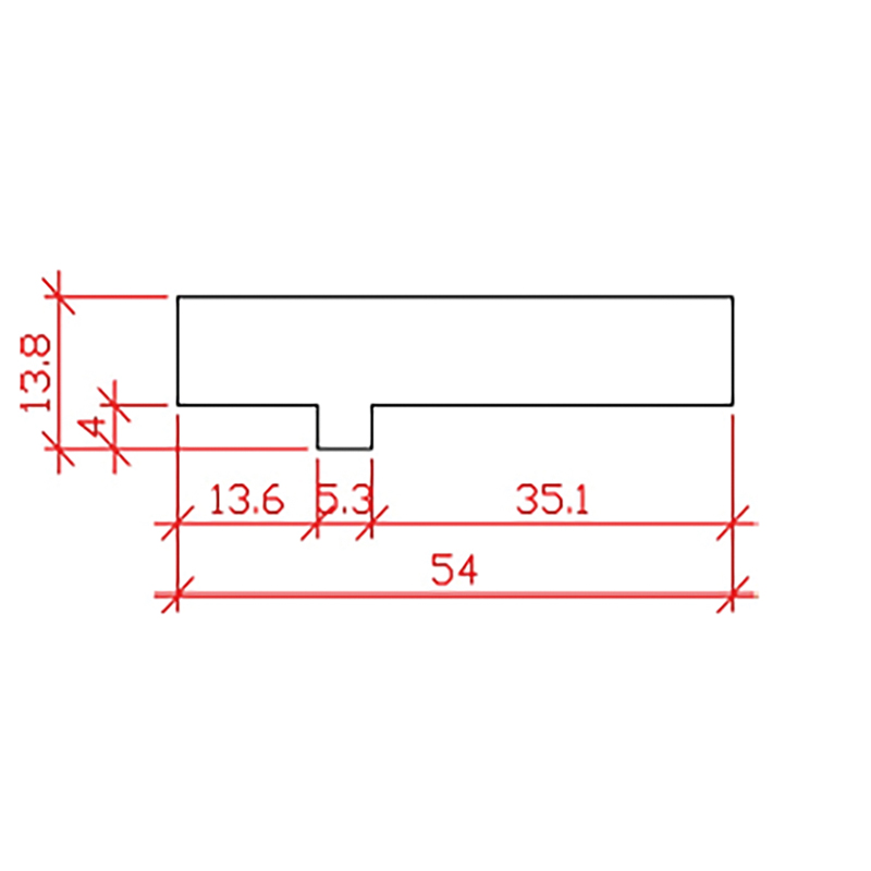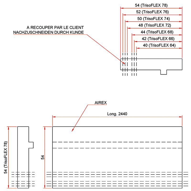 Profilleiste sauber gehobelt in Airex, roh, lichtgeschützte und unverrotbare HST Unterkonstruktion, Standardbreite von 54 mm ist ausgelegt auf TrisoFLEX 78, Profil ist für alle Schwellen einsetzbar und muss je nach Breite der Schwelle längs zurück geschnitten werden