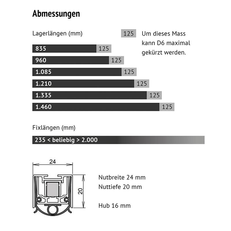 für schlagregendichte Aussentüren 7A nach EN 1027, zum Einnuten für Nutmass 24 x 20 mm, bandseitig auslösend, selbstverlöschendes Silikon-Dichtprofil, bis 51 dB Schalldämmwert, Anschlag mit stirnseitigen Befestigungswinkeln aus Edelstahl, seitliche Zargenfalz-Abdichtung zum Abdichten von Boden-Luft- spalten bis 16 mm