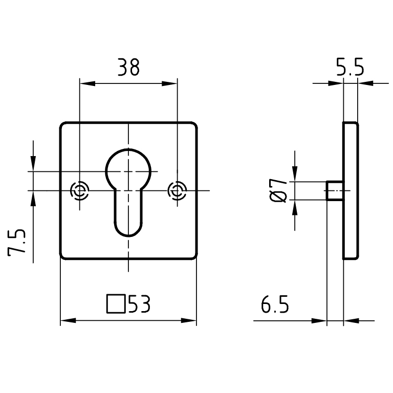 Edelstahl matt, Drückerführung 16 mm, Grundplatte innen mit 2 Führungsnocken, aussen mit Gewindenocken M4, Schraubenlochdistanz 38 mm, mit 2 Schrauben M4 x 45 mm
