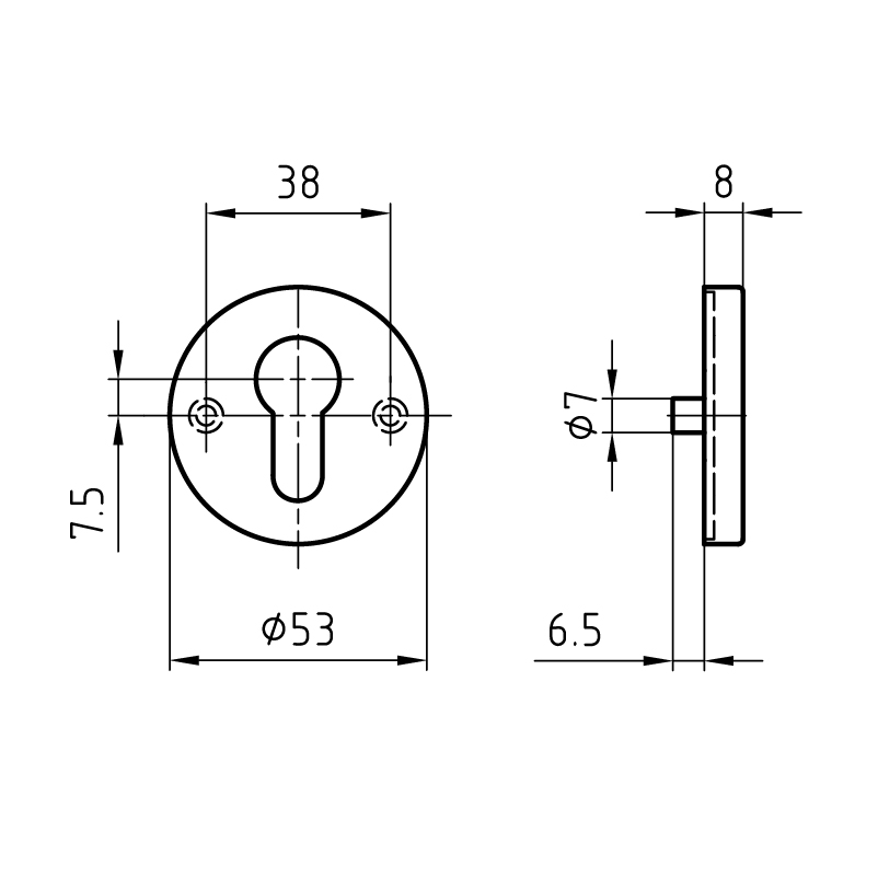Edelstahl matt, verbesserte Grundkonstruktion, Grundplatte innen mit 2 Führungsnocken, aussen mit Gewindenocken M4, Schraubenlochdistanz 38 mm, ohne Schrauben