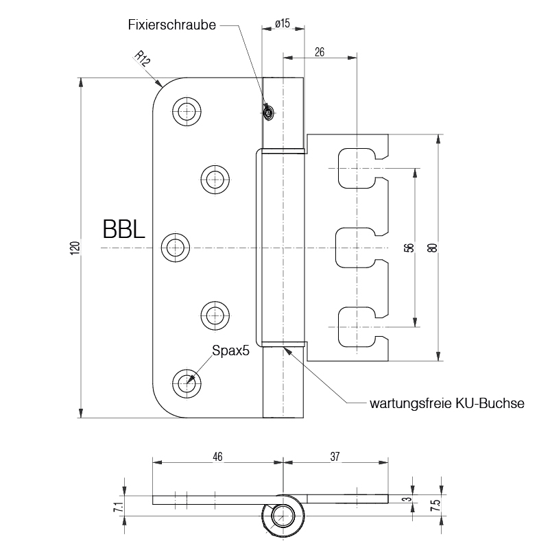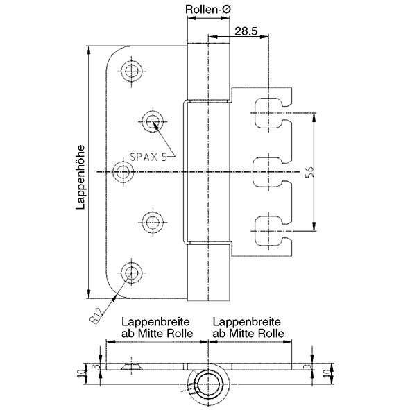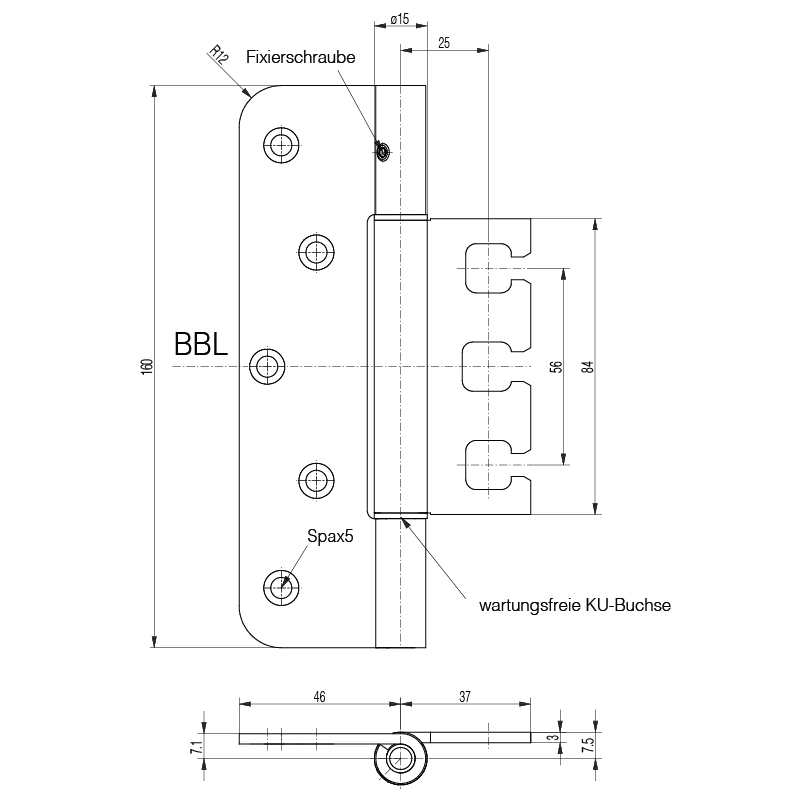 Edelstahl gebürstet, für stumpf einschlagende Türen, wartungsfrei, mit Stiftsicherung, eingebaut demontierbar, schlanke Form durch Rollendurchmesser 15 mm, Lappendicke 3 mm, Anschlagluft 14 mm, zur Verwendung an Türen in Flucht- und Rettungswegen mit Anforderungen an den Rauch- und Brandschutz, Tragkraft, Lappenhöhe 120 mm, bei 2 Band ca. 100 Kilo, Tragkraft, Lappenhöhe 160 mm, bei 2 Band ca. 120 Kilo