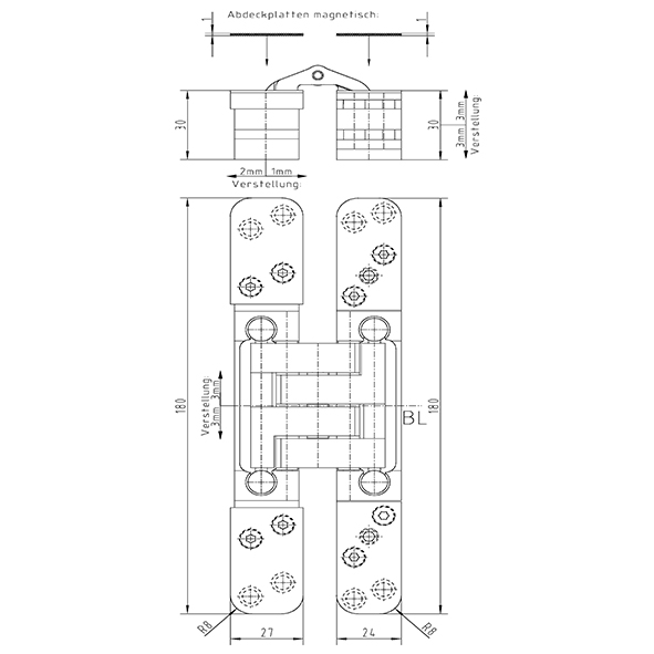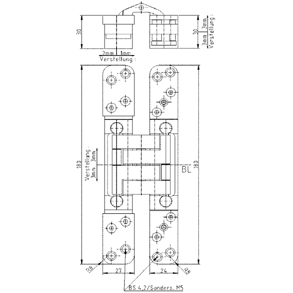 Gehäuse Stahl, Lappen Stahl, für stumpf einschlagende Türen, bei geschlossener Tür ist das Band unsichtbar, 3-dimensionale Verstellung, wartungsfreie Lagerungen, mit sichtbaren Schrauben oder Design, zur Verwendung an Türen in Flucht- und Rettungswegen mit Anforderungen an den Rauch- und Brandschutz, mit Befestigungsschrauben, Tragkraft bei 2 Band ca. 120 Kilo