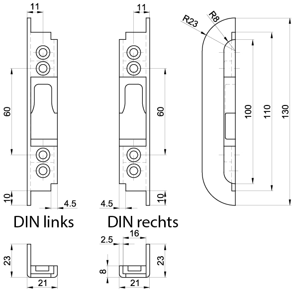 • Bei Montage in Kombination mit Mehrpunkteverriegelung 30700 muss das Schliessblech gewendet werden, da neu der Schliessmechanismus nach unten verriegelt. Somit ist z.B. bei Einbausituation "DIN rechts" ein Set mit DIN links zu verwenden.