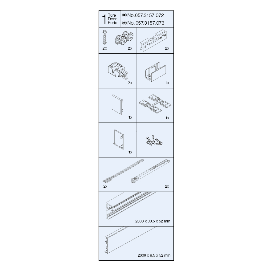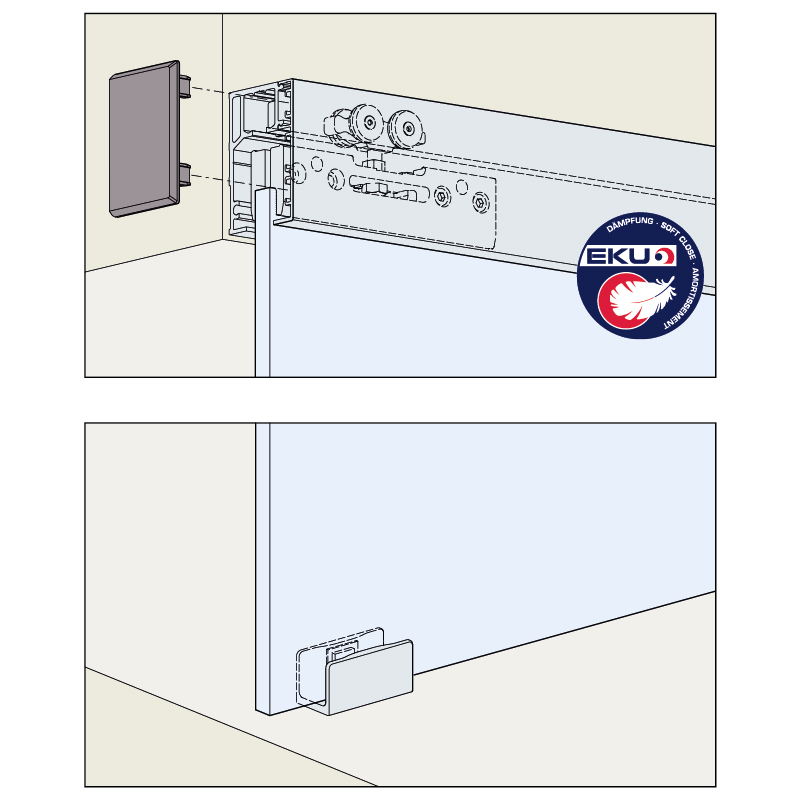 komplett mit Laufgarnitur, Laufschiene 2000 mm, Clip-Blende 2000 mm und Endkappen-Set, mit unsichtbarer Dämpfung, in Laufschiene integriert