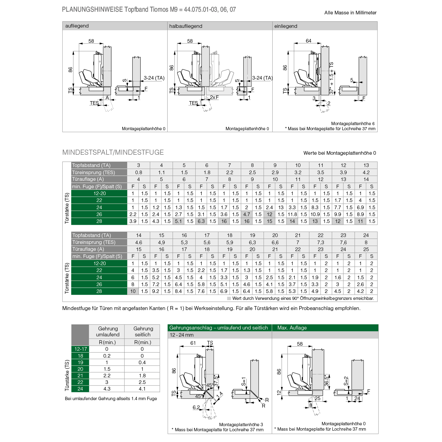 Topfband GRASS® Tiomos M9 110° Click-on, für dünne Möbeltüren und 45° Gehrungsanschlag, Bohrbild 45 / 9,5