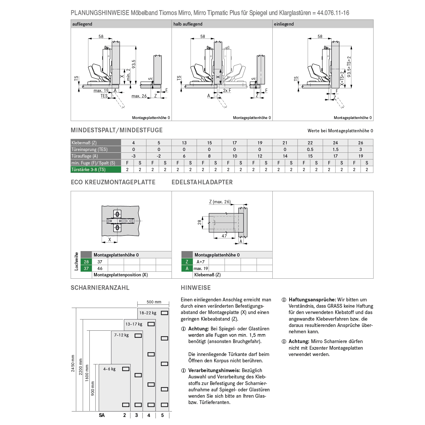 - Verarbeitungshinweis: Bezüglich Auswahl und Verarbeitung des Klebstoffes zur Befestigung der Scharnieraufnahme auf Spiegel- und Glastüren wenden Sie sich an Ihren Glas- bzw. Türlieferanten.