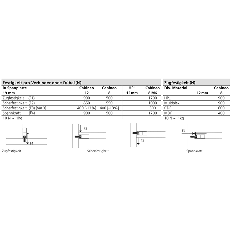 Verschleissfreier Verbinder aus glasfaserverstärktem Kunststoff, für diverse Materialien und erhöhte Festigkeit, Gegengewinde kann direkt ins Material geschnitten werden, HPL, Aluminium, Stahl, etc., keine Abnützung des Werkstückes bei mehrmaligem Auf- und Wiederabbau, Prozessoptimierung durch reine Flächenbearbeitung mit CNC ohne Kantenbohrungen, bei Mittelwänden greifen die Schrauben von beiden Seiten in die selbe Muffe, dadurch entsteht eine enorme Spannkraft, geeignet für Möbelbau, Innenausbau, Messebau, Ladenbau, Einbauschränke, freistehende Schränke, Küchenkorpusse, Wohnwände und Bücherregale, flächenbündiges Einfräsen der Abdeckkappen möglich, Verwendung mit oder ohne Abdeckkappen