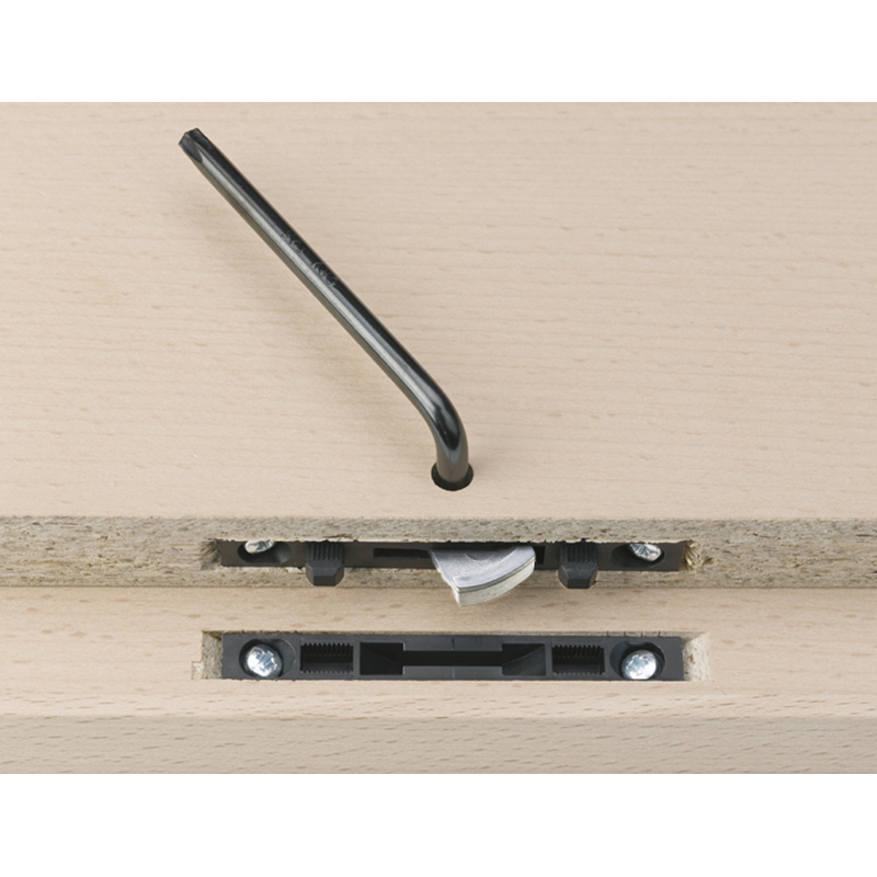 aus glasfaserverstärktem Kunststoff, mit Metallriegel für wieder lösbare Konstruktionen wie zerlegbare Möbelverbindungen, Flächen-, Eck- und Mittelwandverbindungen, Plattengehrungen in allen Winkeln, hohe Auszugwerte und feste Verankerung in diverse Materialien, Festigkeit bei Querbeanspruchung, Werkstücke werden beim Schliessen zusammengespannt, schnelles Einfräsen mit Nutfräsmaschine