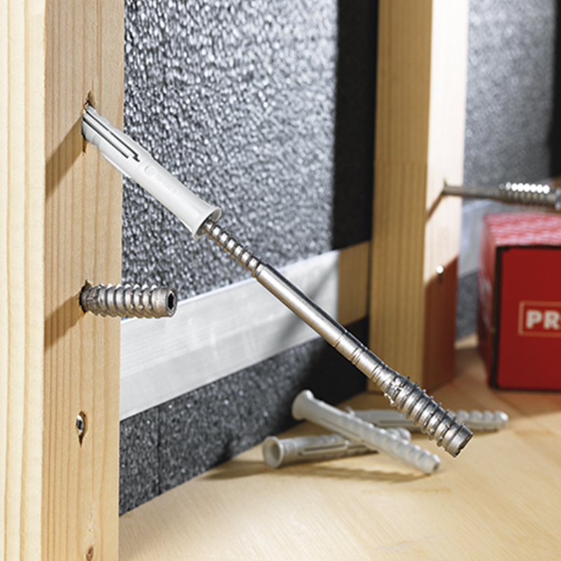 Stahl, Zink-Nickel beschichtet, für erhöhten Korrosionswiderstand, macht eine Kunststoff-Ummantelung überflüssig, Zylinderkopf, für die Montage von Unterkonstruktionen von hinterlüfteten Fassaden, der grosse Vorteil liegt darin, dass die Wärmedämmung vollflächig verlegt werden kann, der Wärmebrückenverlust liegt Dank dem optimierten Schrauben-Ø zwischen 0,0035 und 0,0045 W/K, schnelles Ausrichten der Lattung und Korrektur von Toleranzen in der Fassade, Bohrloch Ø 10 mm in Lattung und Ankergrund, ohne Dübel