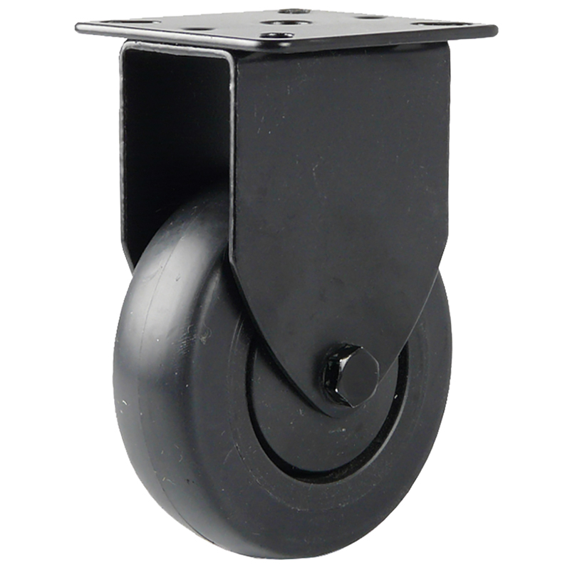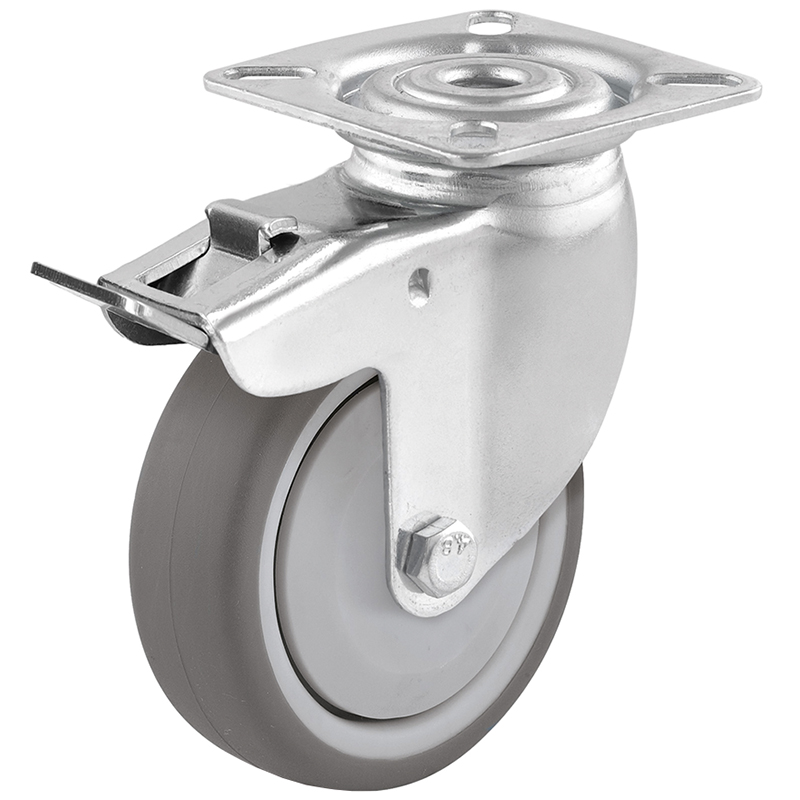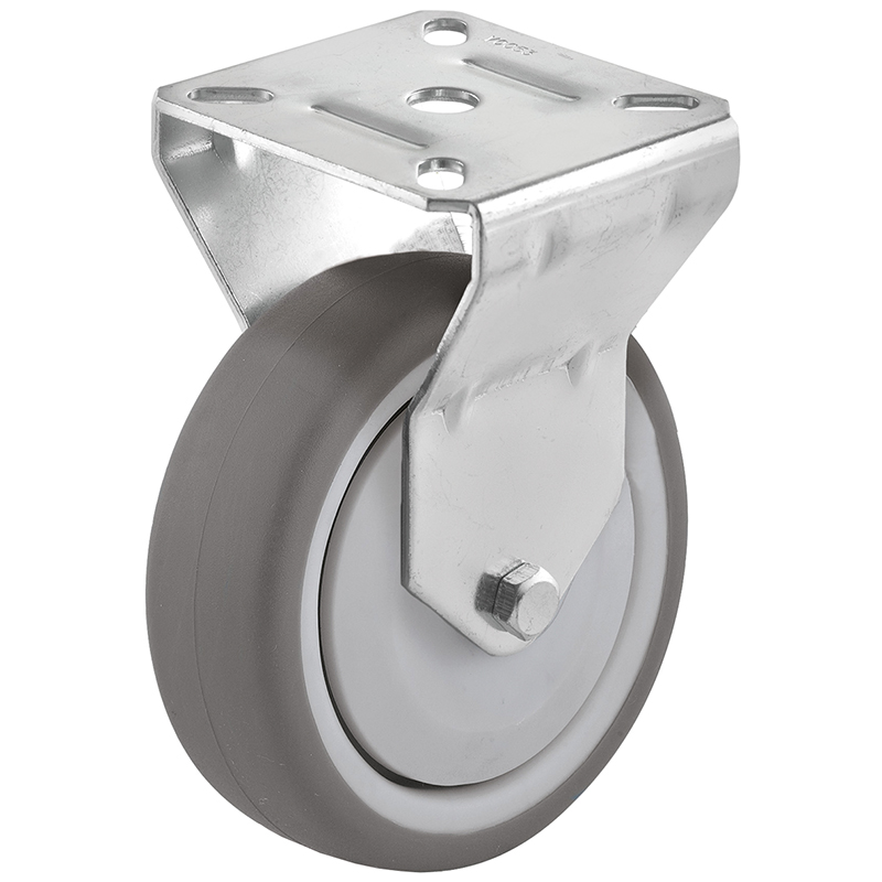 Stahlblechgehäuse verzinkt oder schwarz, Gabelkopf mit 2-facher Kugellagerung, Lauffläche aus thermoplastischem Gummi grau oder schwarz, spurlos, Radachse verschraubt, Radkörper aus Polypropylen mit Kugellager und Fadenschutz, temperaturbeständig -20° bis +70° C