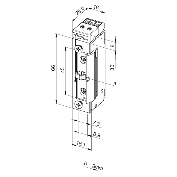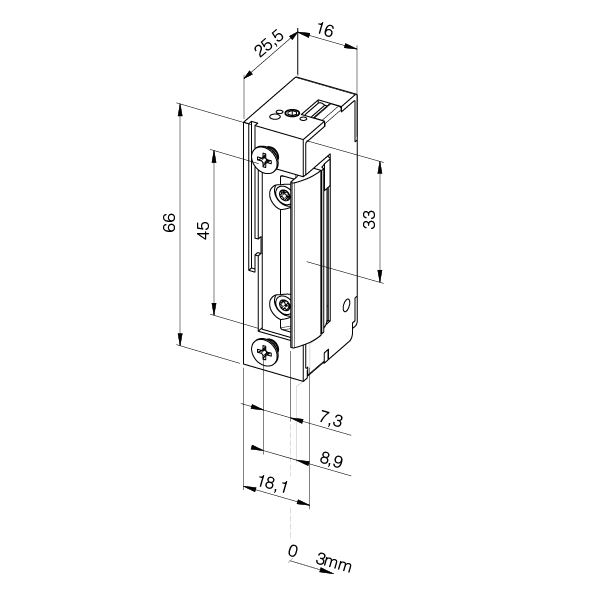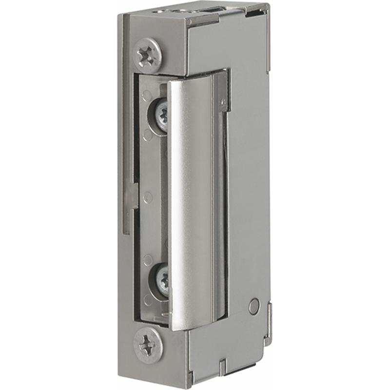 Arbeitsstrom-Türöffner mit Radiusfalle, auch als Sicherheitstüröffner einsetzbar, Türe kann nur während der Kontaktgabe (Impuls) geöffnet werden, bei Wechselstrom-Betrieb Summton hörbar, (Dauerbetrieb mit Gleichstrom möglich), FaFix Verstellbereich 3 mm, symmetrische Bauform, universal DIN rechts und DIN links einsetzbar, für senkrechten und waagrechten Einbau, Festigkeit gegen Aufbruch 9000 N, ohne Schliessblech