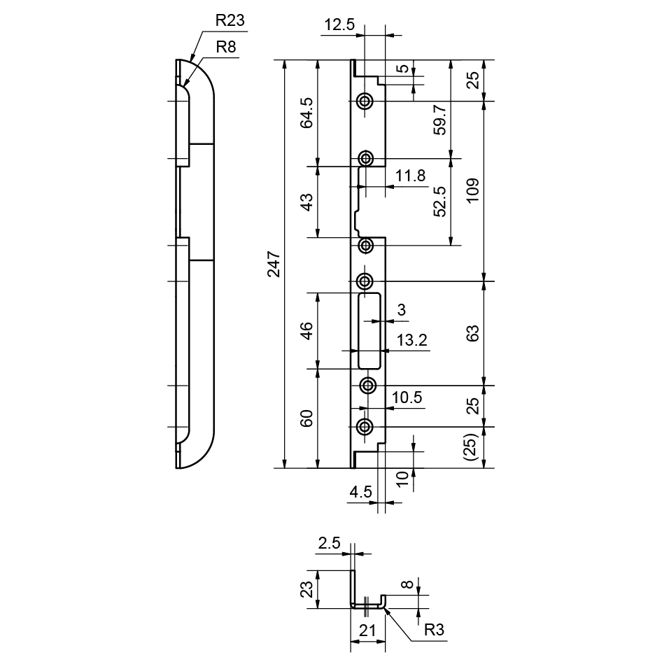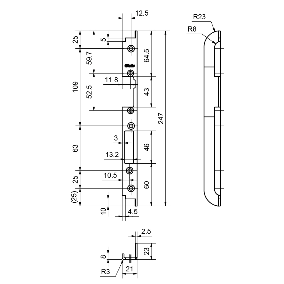 Einfrässchliessblech als Hauptschliessblech für Falle / Riegel und E-Öffner, geeignet für die E-Öffner der Serie GLUTZ Kompakttüröffner A5xxx und Feuerschutztüröffner FT5xx, für Einsteckschlösser und Mehrfachverriegelungen mit Entfernung 78 mm, das Schliessblech ist für gefälzte Türdesigns vorgesehen
