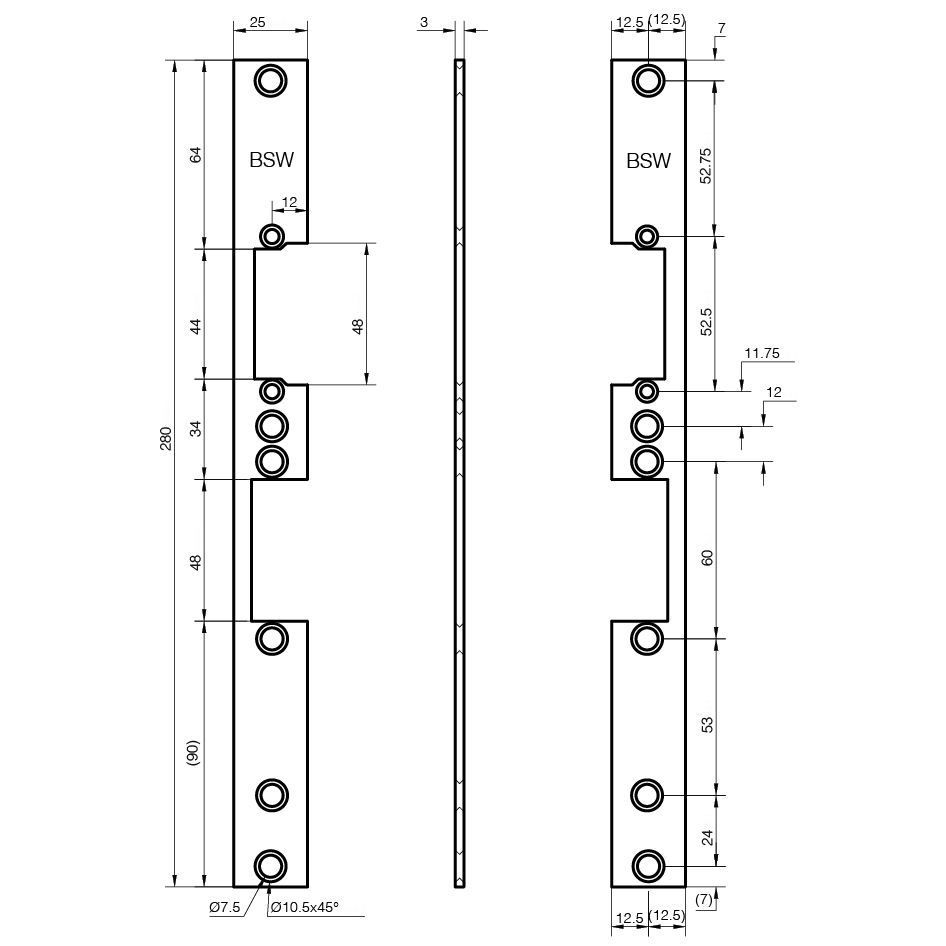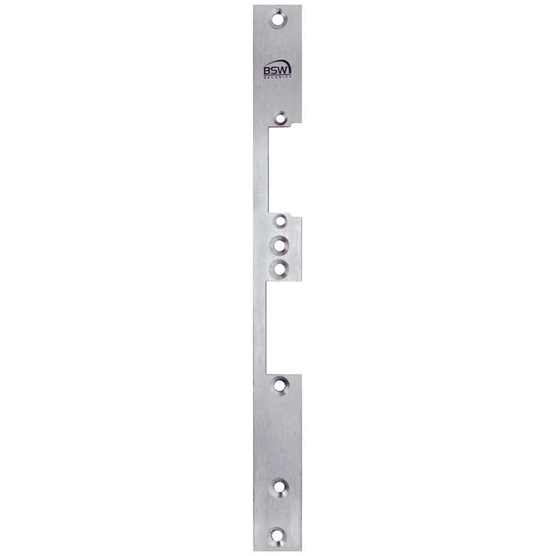 Edelstahl, Steg 34mm, mit 2 Befestigungslöchern, mit zwei Fallenauschnitten für 1 Standardtüröffner Typ A oder B und 1 Fluchttüröffner Typ C oder D