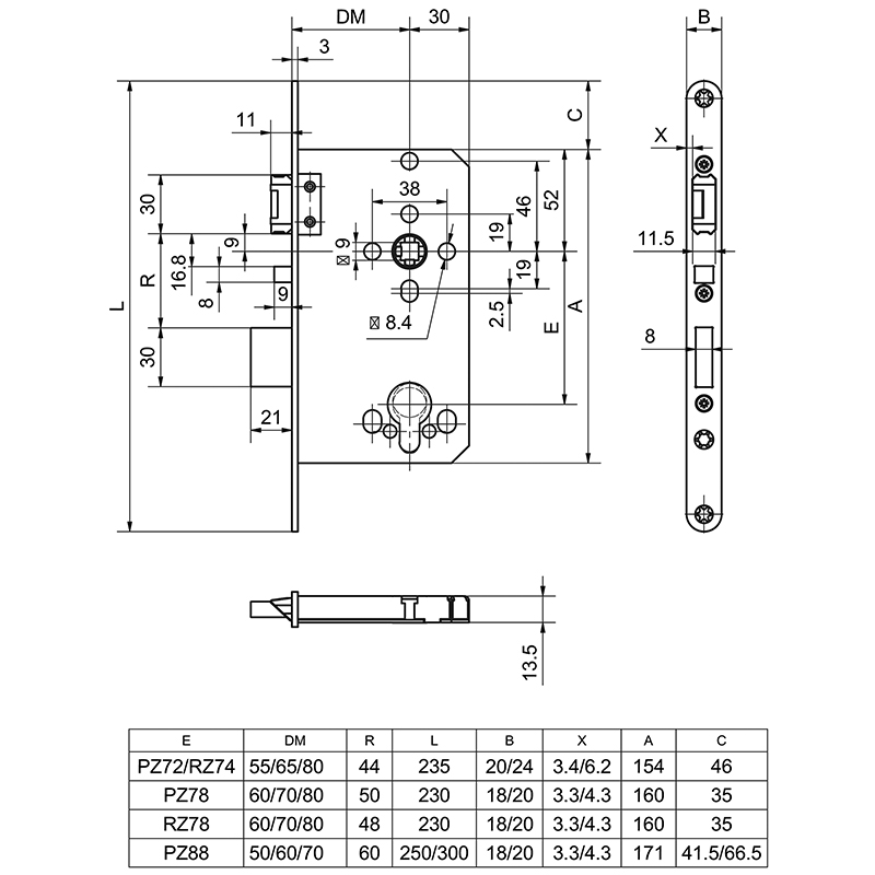 Panik-Einsteckschloss GLUTZ 12400 SV PE, selbstverriegelnd, Panik E, Rundstulp 18 x 230 mm, Edelstahl