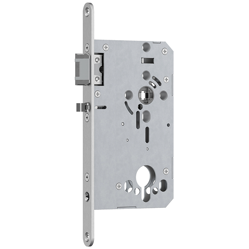 Edelstahl matt, Falleneinsteckschloss mit Fallenblockierung und Panik B-Funktion, Mittiger Schlosskasten, für Verbindungs- oder Fluchttüren kann bei Tages- oder Nachtbetrieb der Aussendrücker über den Zylinder mit einer Schlüsselumdrehung ein- oder ausgekuppelt werden, leises Schliessen der Türe durch die Komfortfalle sowie gedämpfter Fallenausstoss, spielfreie Drückerlagerung durch die zweiteilige durchgehende Klemmnuss, lineares Drückerbetätigungs- und Hochhaltemoment durch neues Federdesign, geprüft nach EN 179, EN 1125, EN 1634, EN 12209