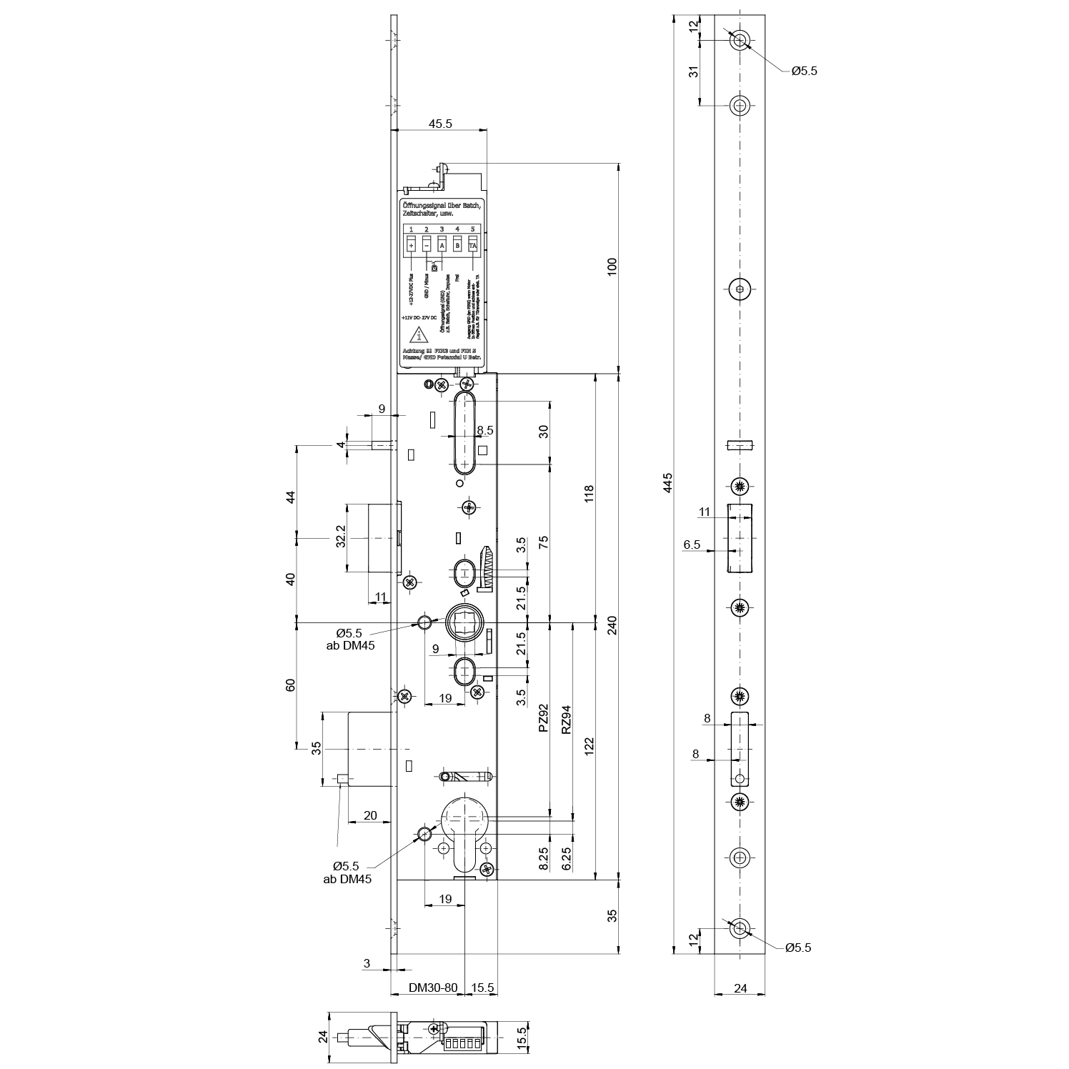 - Elektrische Schnittstelle RS485, z.B. für direkte Kommunikation via Biometriescanner und Fehlerspeicher. Manipulationsschutz Öffnungsimpuls nur noch via BUS.