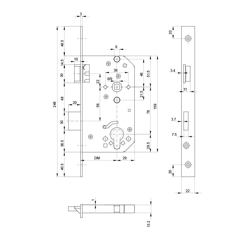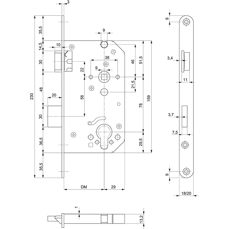 Acier galvanisé, avec rainure, pour serrure anti-panique à mortaiser avec fouillot en 2 parties