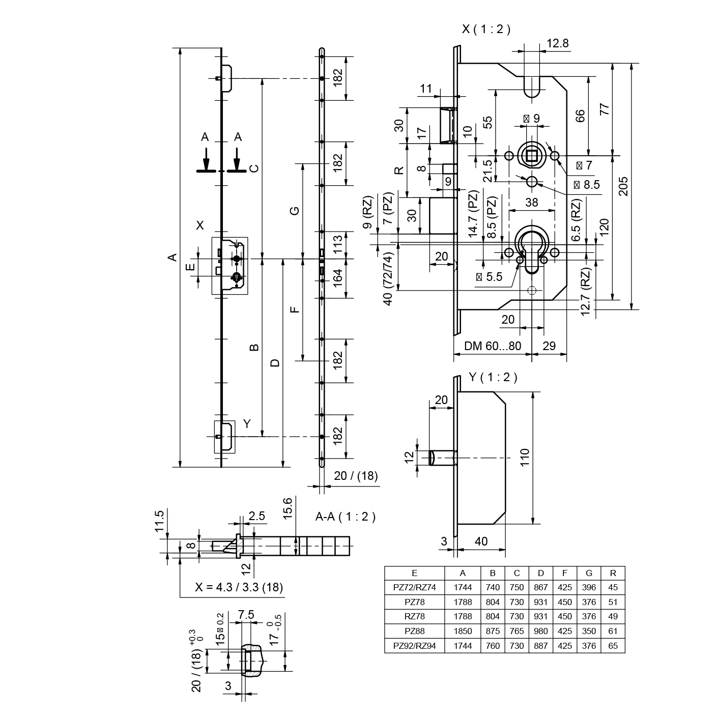 Mehrpunktverriegelung GLUTZ MINT 18970 SV ELK PC, selbstverriegelnd, elektrisch kuppelbar, Panik C, auswärts / einwärts öffnend, Rundstulp 18 / 20 x 1788 mm, Edelstahl matt