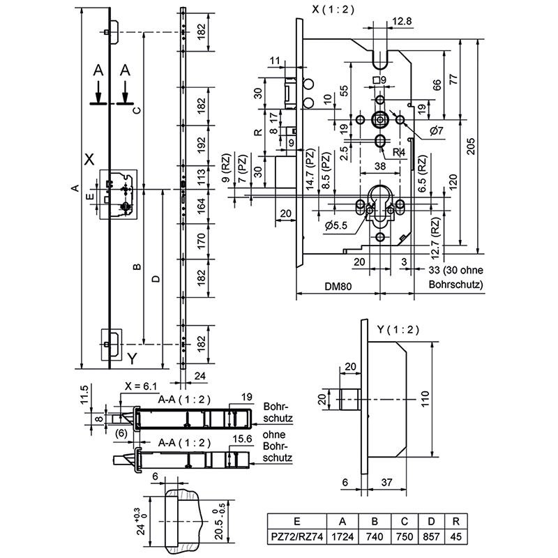 Panik-Mehrpunktverriegelung GLUTZ MINT 18972HZ SV ELK BK, (Elementgeprüft bis WK4) mit U-Stulp 1724 x 24 x 6 mm