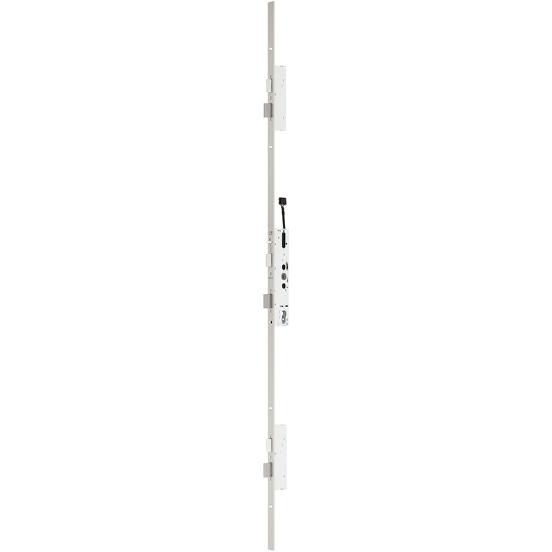 Diese Mehrpunktverriegelungen sind mit Überwachungs- / Rückmeldekontakten ausgestattet. (Überwachung Steuerfallenstatus, Türdrückerstatus, Riegelstatus und Zylinderstatus). Das Verlassen bei verriegelter Türe, ist über den Innendrücker, eine Panikstange oder eine Pushbar jederzeit möglich. Diese ziehen die 3 Langriegel zurück und gleichzeitig werden die 3 Kippfallen weich (Panikfunktion). Von aussen ist ein Knauf oder eine Griffstange montiert. Die Türe lässt sich mit dem Schlüssel über den Wechsel von aussen öffnen. Wenn die Türe schliesst, verriegelt das Schloss automatisch (Selbstverriegelung).