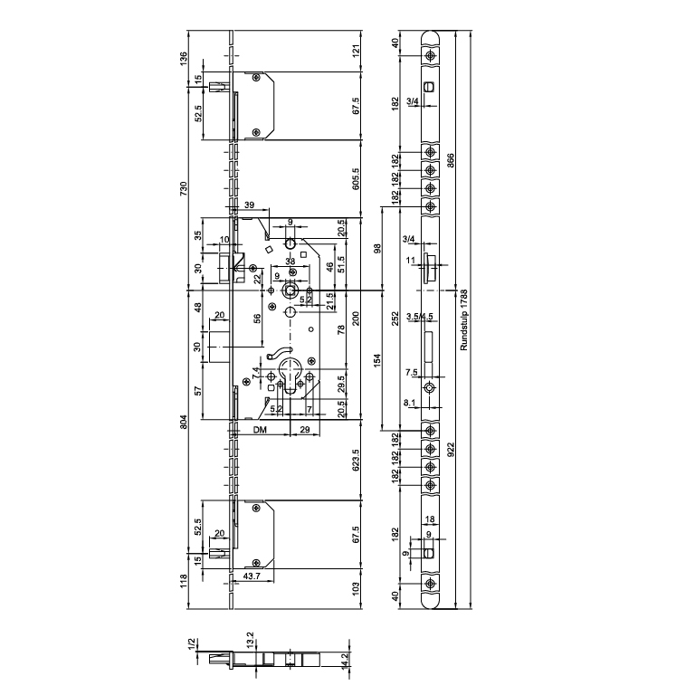 4-Punkt-Verriegelung durch Hauptriegel, 2 Riegelbolzen und Fallenblockierung, Bolzen- und Riegelvorschub 20 mm, 1-tourig, aus hochwertigem Spezialstahl, geteilte Nuss 9 mm, ohne Wechselfunktion,