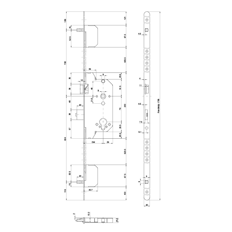 4-Punkt-Verriegelung durch Hauptriegel, 2 Riegelbolzen und Fallenblockierung, Bolzen- und Riegelvorschub 20 mm, 1-tourig, aus hochwertigem Spezialstahl, durchgehende Nuss 9 mm, mit Wechselfunktion, Mitte Nuss bis OK Schlosskasten 51,5 mm