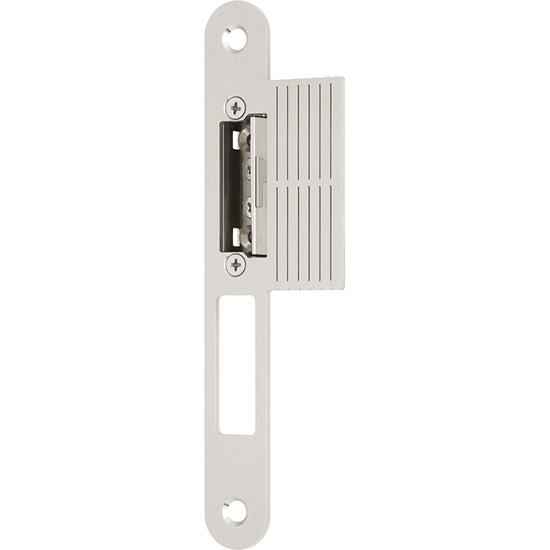 Edelstahl matt, abgerundet, mit Austauschstück (ATS) verstellbar von 0 bis 3 mm, mit Ausschnitt für Riegel und Falle, vorbereitet für Riegelschaltkontakt 1886, ohne Schrauben