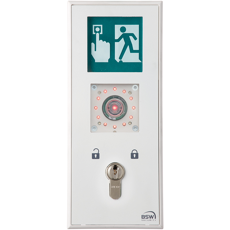 zur Steuerung und Überwachung einer Fluchttür nach EN13637, mit Schlüsselschalter PZ, Steuerung, hinterleuchtetes Piktogramm und optische / akustische Anzeigen integriert, Programmierung und Bedienung erfolgt am Terminal über Schlüsselschalter, externe Türfreigabe über Schlüsselschalter möglich, bei Sabotage am externen Schlüsselschalter kann die Türfreigabe gesperrt werden, Überwachung der Tür mit Tür- und Ankerkontakt, Freigabe durch Brandmeldeanlage, Montage aufputz oder unterputz, passt in Schweizer- und EU-Unterputzdosen, Bedienteile wie Schlüsselschalter anschliessbar, 2 Relais für Alarm bis zur Quittierung, Türstatus bzw. Türfreigabe: 24 V DC, 1,25 A, ohne Halbzylinder